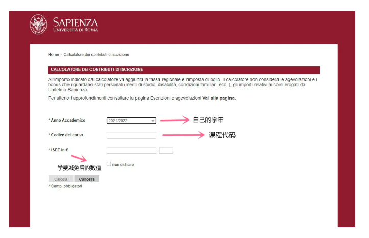 在自己所在的大学网站里搜索:SIMULATORE TASSE 这个词即可搜寻到。